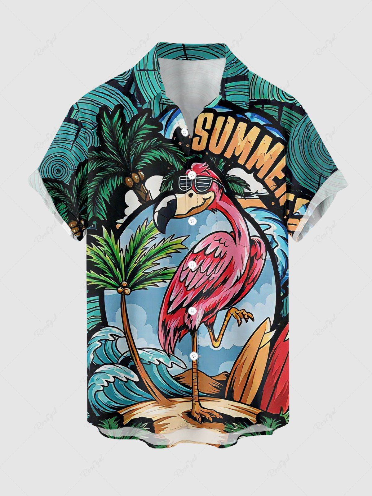 Chemise hawaïenne à poches boutonnées, imprimé cocotiers, flamants roses et vagues, grande taille pour homme - 5xl
