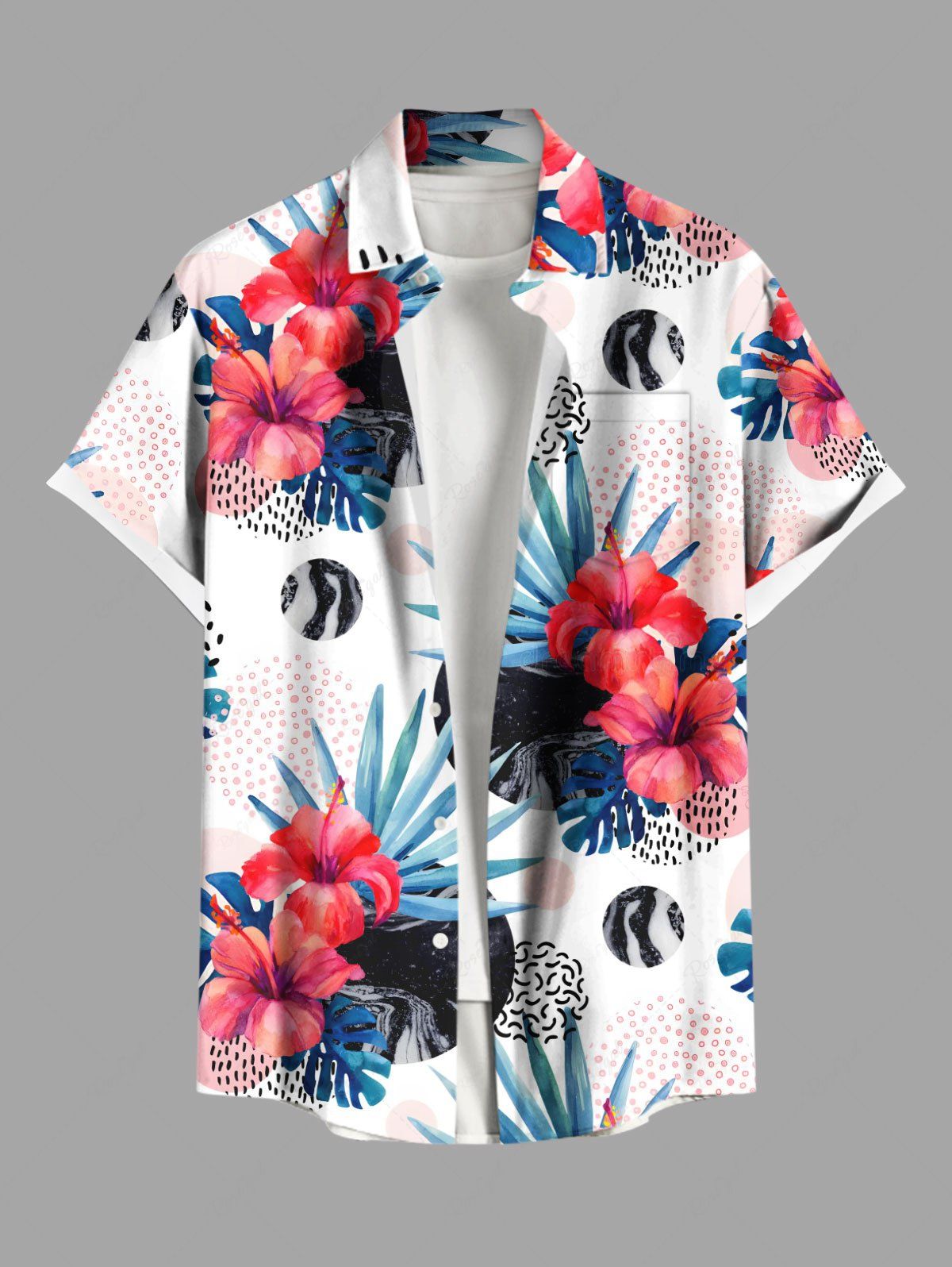 Chemise hawaïenne grande taille à imprimé géométrique, fleurs d'hibiscus, feuilles tropicales, boutons et poches pour homme - M