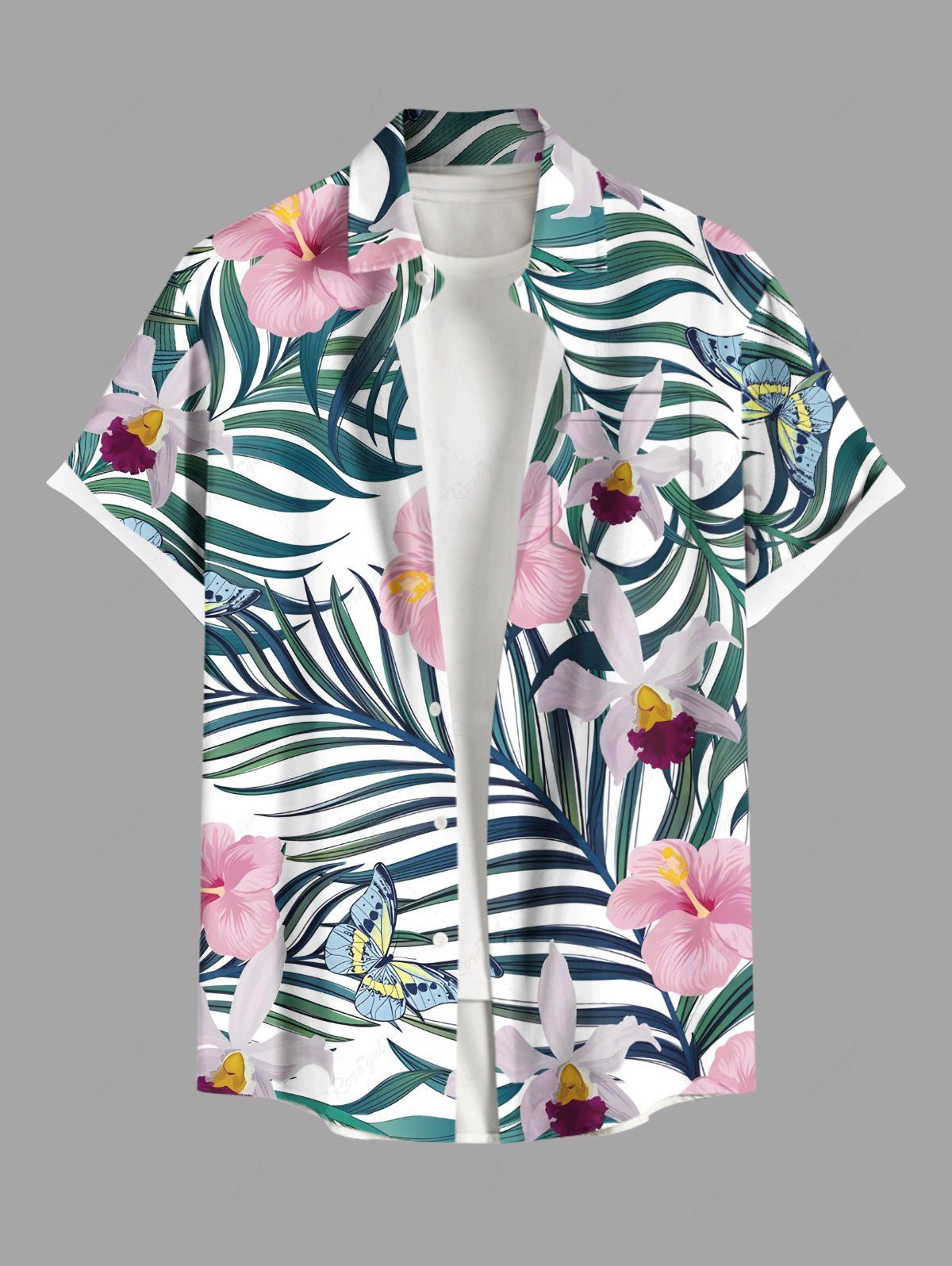 Chemise hawaïenne grande taille pour homme, à imprimé feuilles tropicales et fleurs d'hibiscus, boutons et poche. - M