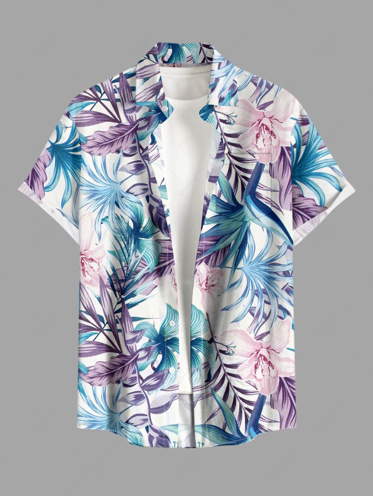 Chemise hawaïenne grande taille pour homme, à imprimé feuilles tropicales et fleurs d'hibiscus, boutons et poche. - 6xl