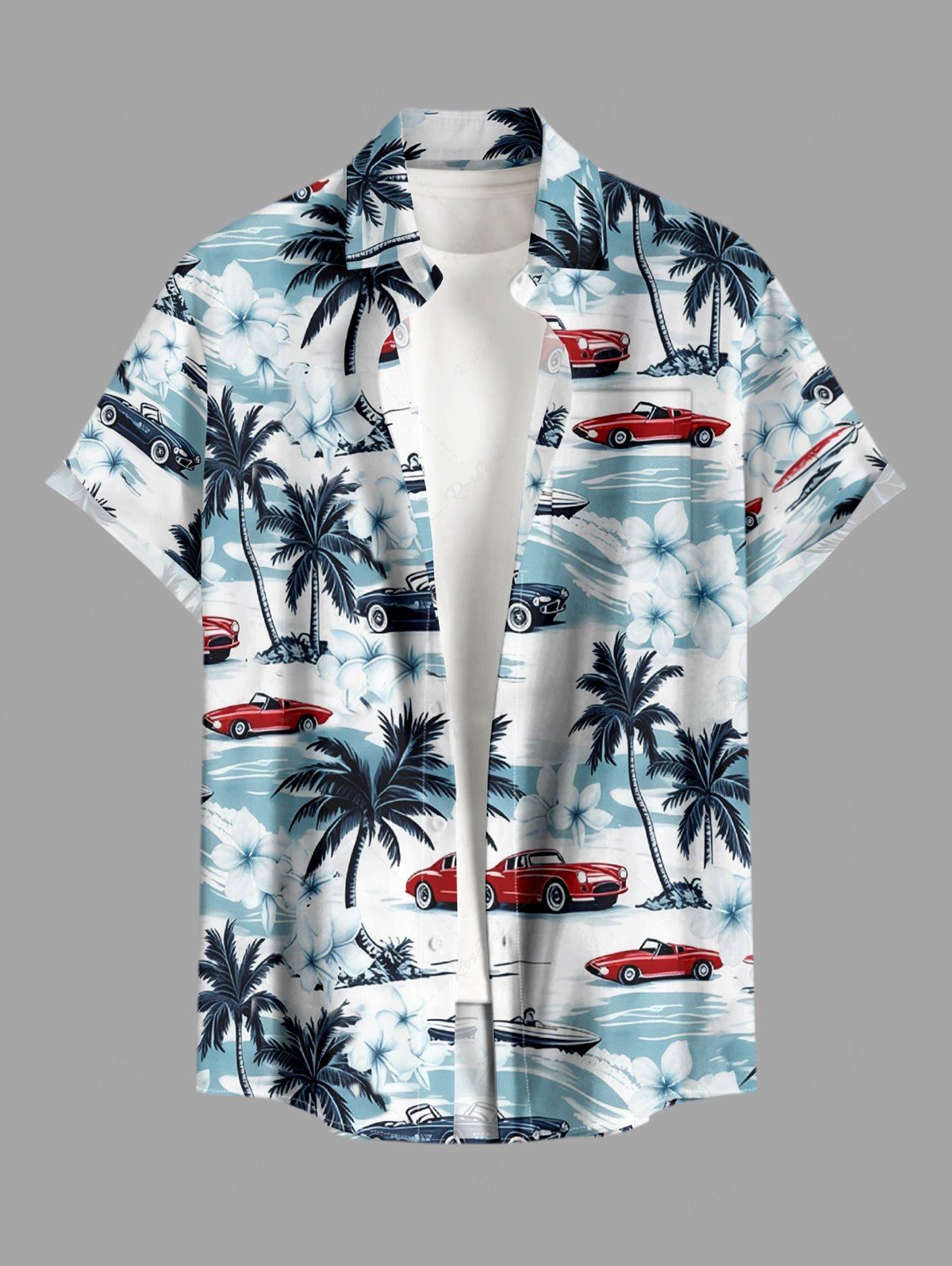 Chemise hawaïenne grande taille pour homme, à motifs de cocotiers, de vagues et de voitures, avec poches et boutons. - M