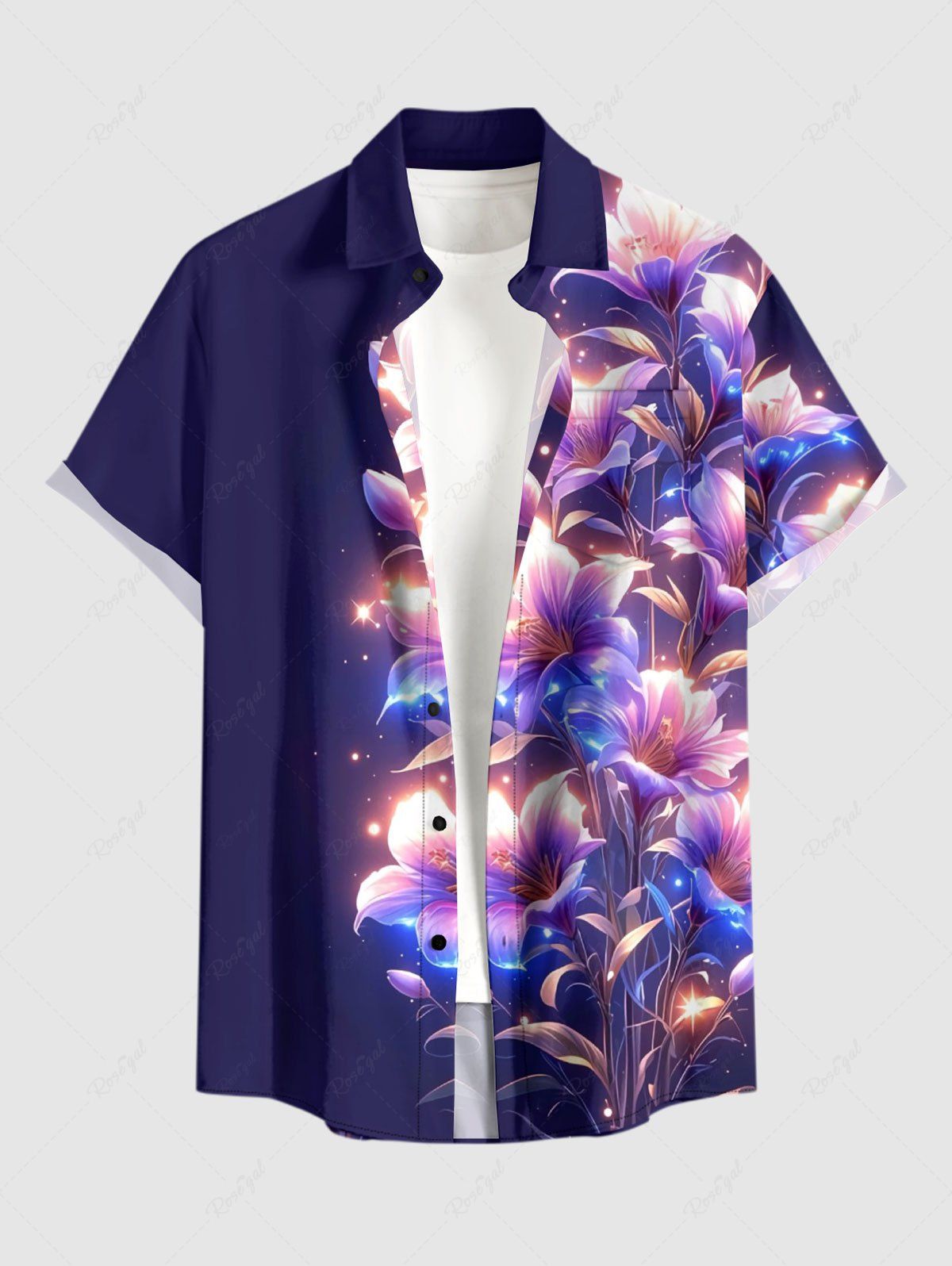 Chemise hawaïenne grande taille pour homme, imprimée de fleurs et de feuilles à paillettes en 3D, avec boutons et poche. - 6xl