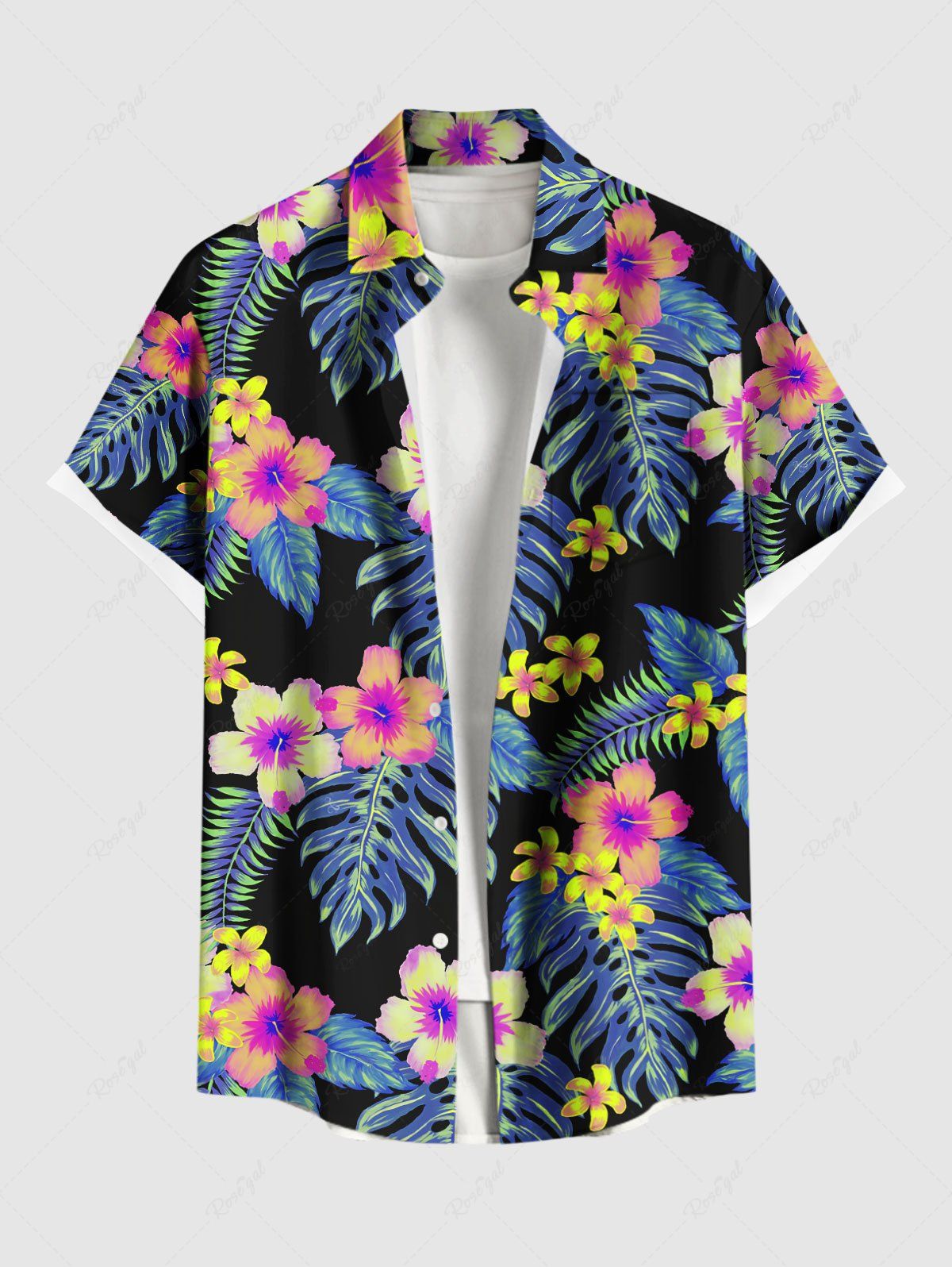 Chemise Imprimé à Fleurs et Feuilles Tropicales Grande Taille avec Boutons pour Homme - M