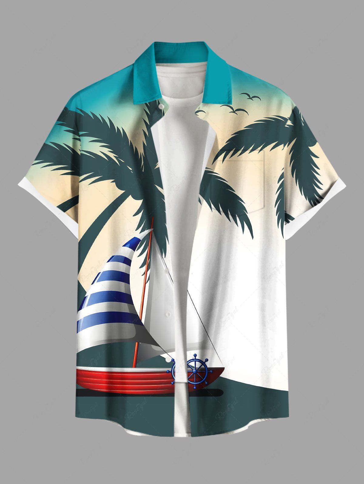 Plus Size Coconut Tree Sailboat Rudder Ombre Print Buttons Pocket Hawaii Shirt For Men - M