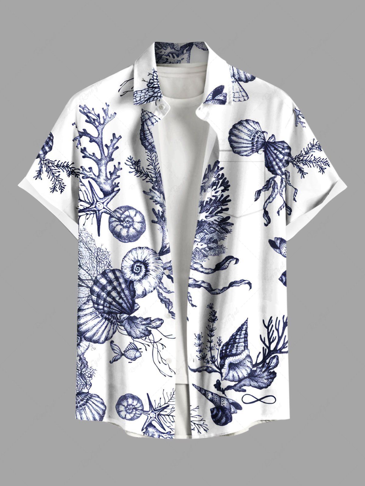 Plus Size Conch Shell Coral Starfish Print Hawaii Sea Creatures Button Pocket Shirt For Men - M