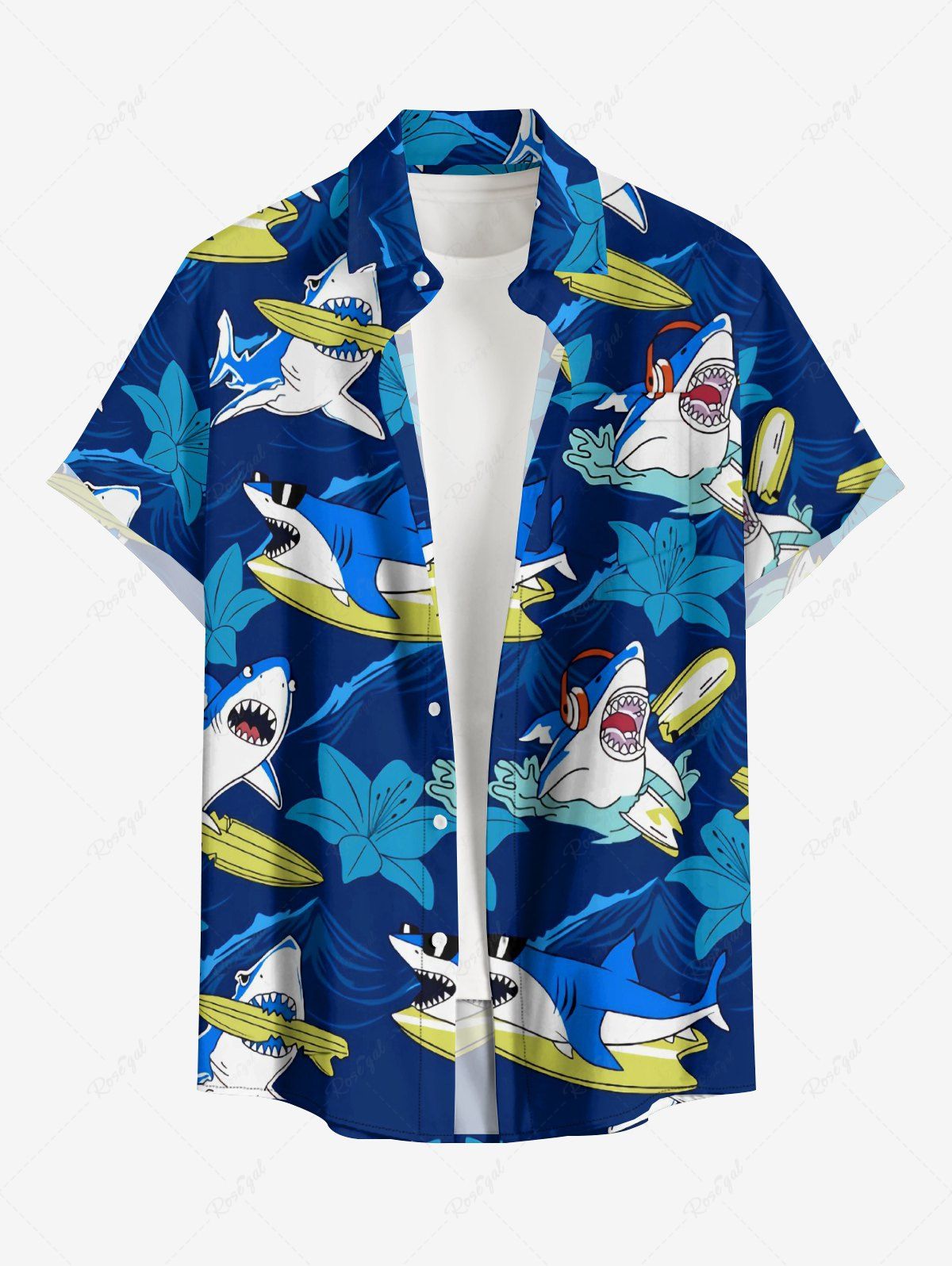 Plus Size Shark Sea Waves Hibiscus Flower Print Hawaii Button Pocket Shirt For Men - 3xl