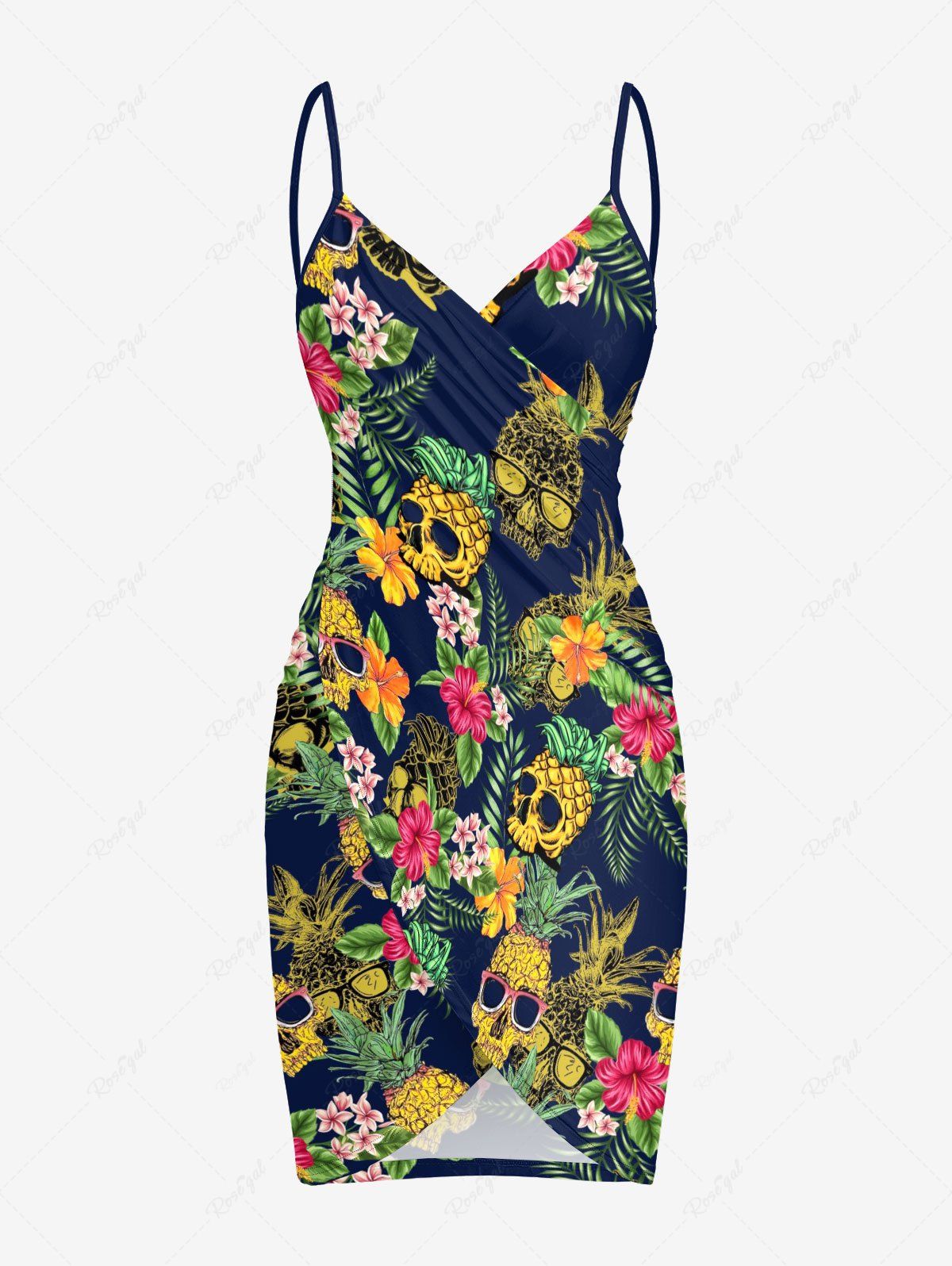Paréo de plage convertible grande taille à imprimé tête de mort, ananas, feuilles tropicales et hibiscus, style hawaïen - S