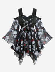 • Plus Size Skull Bowknot Heart Printed Mesh Lace Up Flare Sleeve Handkerchief Top Taille: 3X | US 22-24 Couleur: BLACK