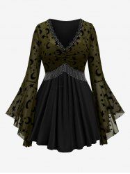 • Plus Size Gothic Moon Star Print Mesh Panel Bell Sleeves Ruched Chain Tassel Long Sleeves T-shirt Taille: 4X | US 26-28 Couleur: DEEP RED