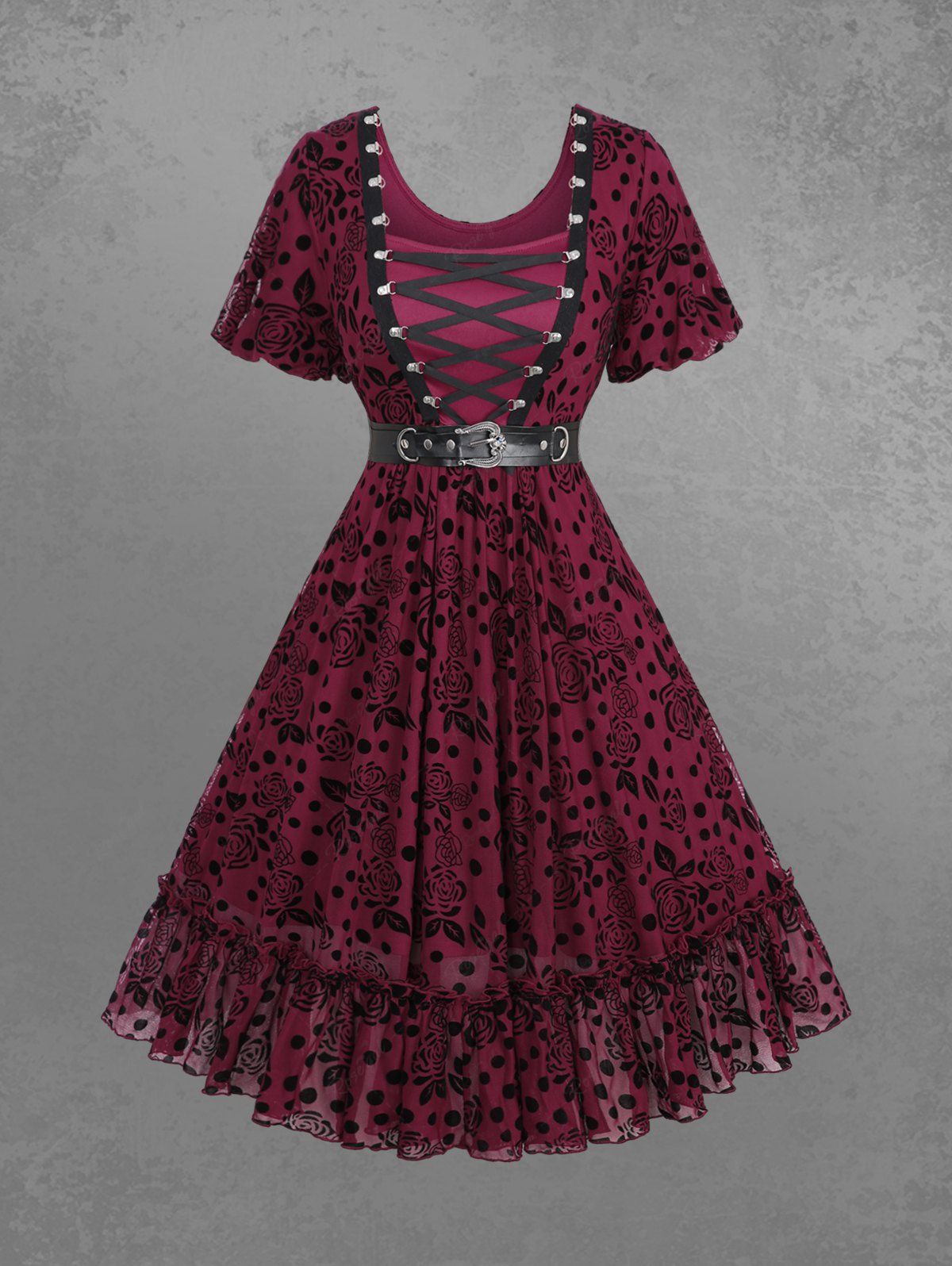 Robe débardeur gothique grande taille à lacets en maille floquée florale, œillets, boucle, bordure en dentelle