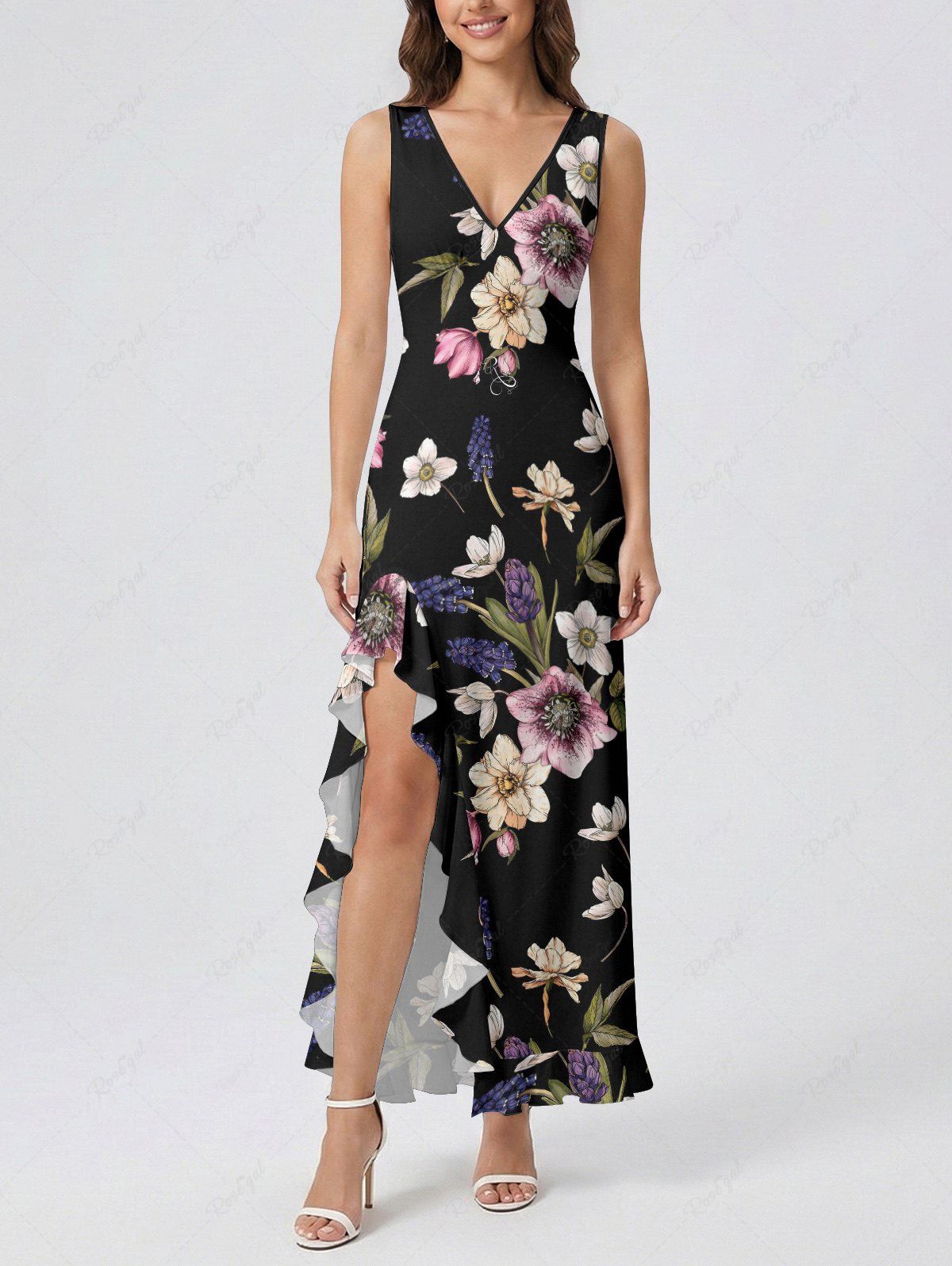 Flower Leaf Print Hawaii Ruffles Split Dress - L