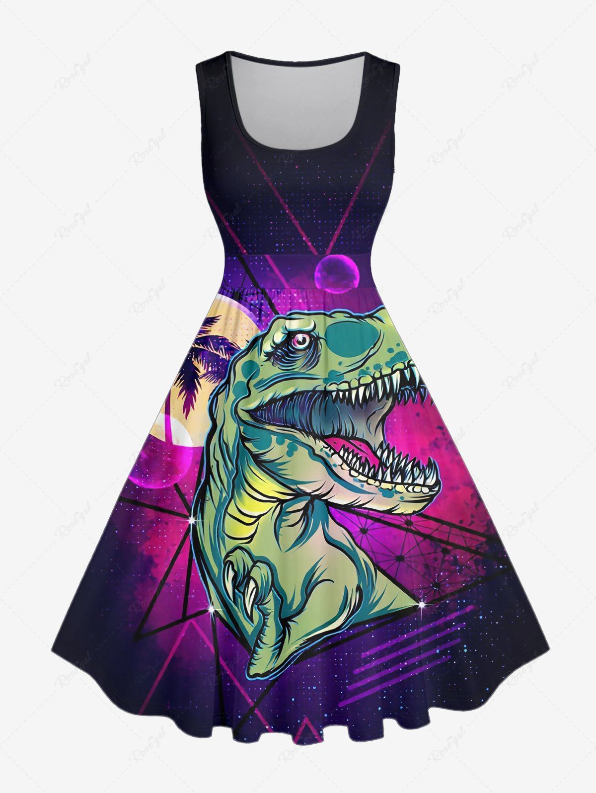 Plus Size Coconut Tree Moon Dinosaur Galaxy Print Hawaii Vintage Swing A Line Dress - L
