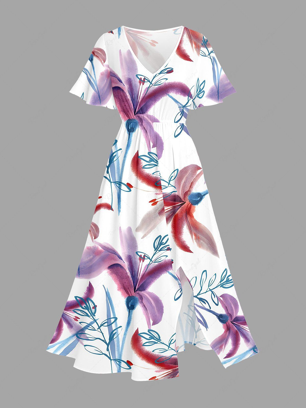 Plus Size Flower Leaf Branch Print Hawaii Split Pocket A Line Midi Dress - 2x