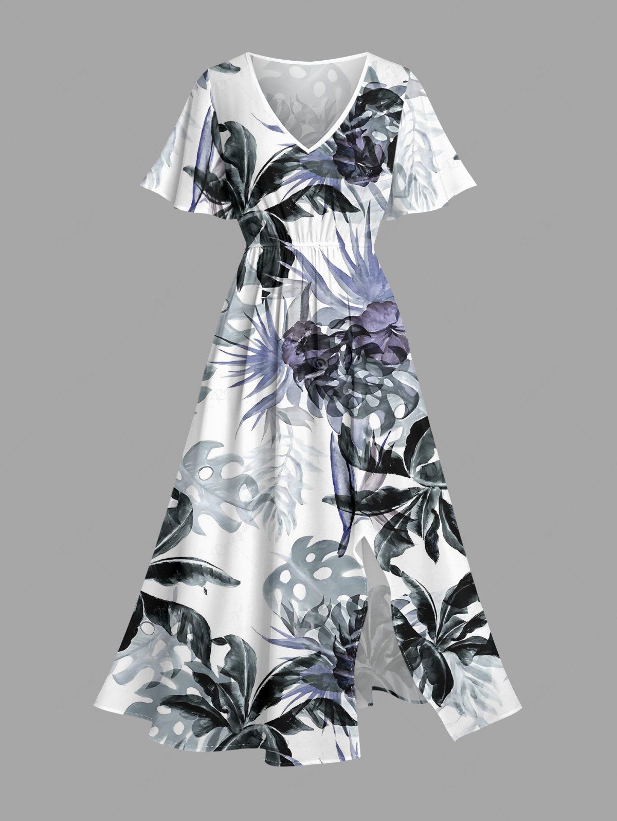 Robe mi-longue hawaïenne fendue à imprimé floral et feuilles grande taille - 5x