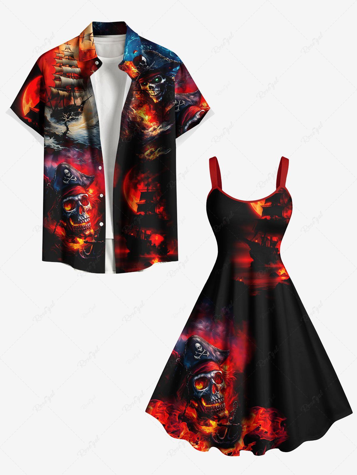 Tenue d'Halloween grande taille assortie pour couples, motif crâne, pirate, vagues, bateau, feu, flamme