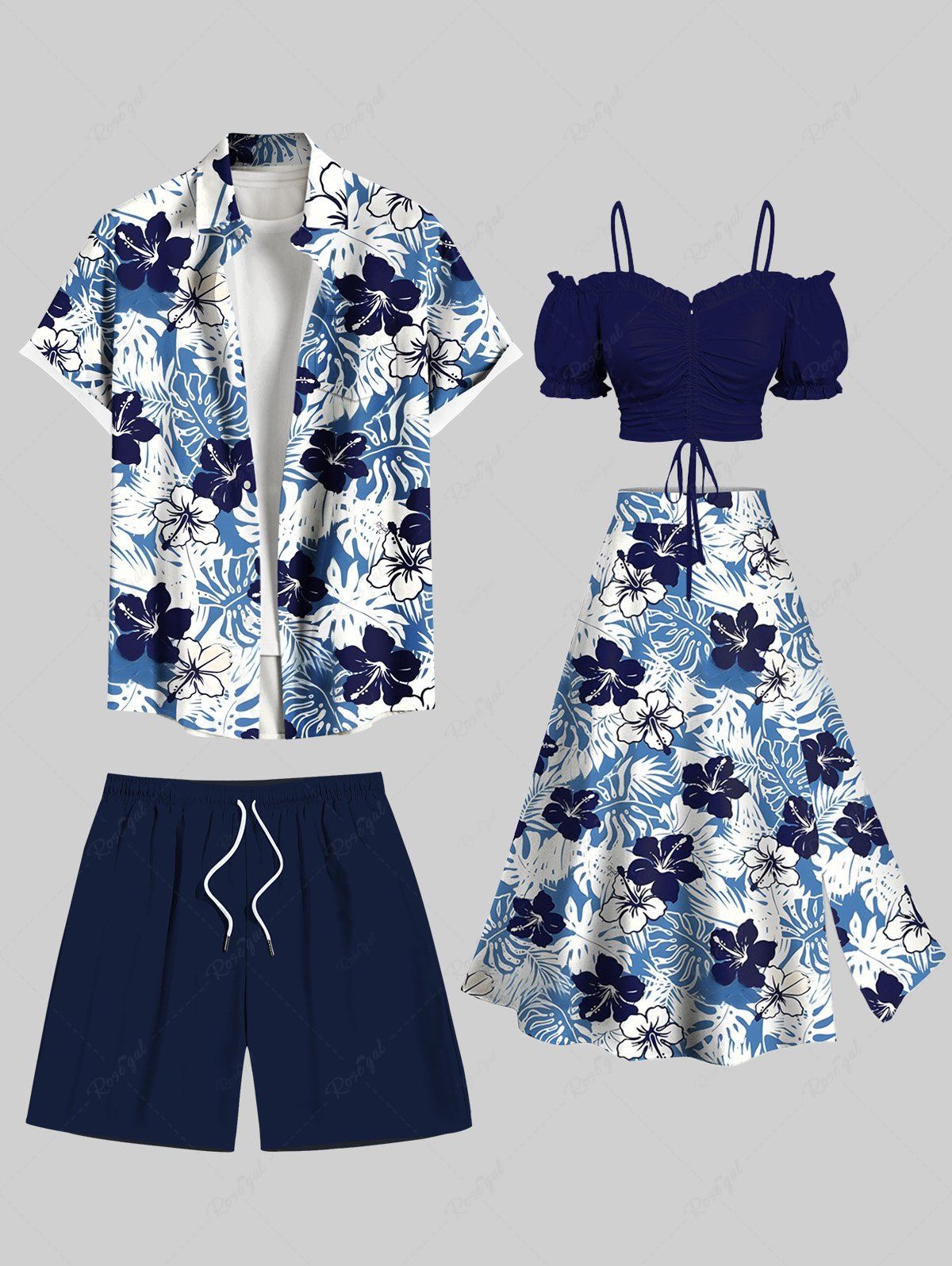 Tenue de plage hawaïenne assortie grande taille à imprimé feuilles tropicales et fleurs pour couples