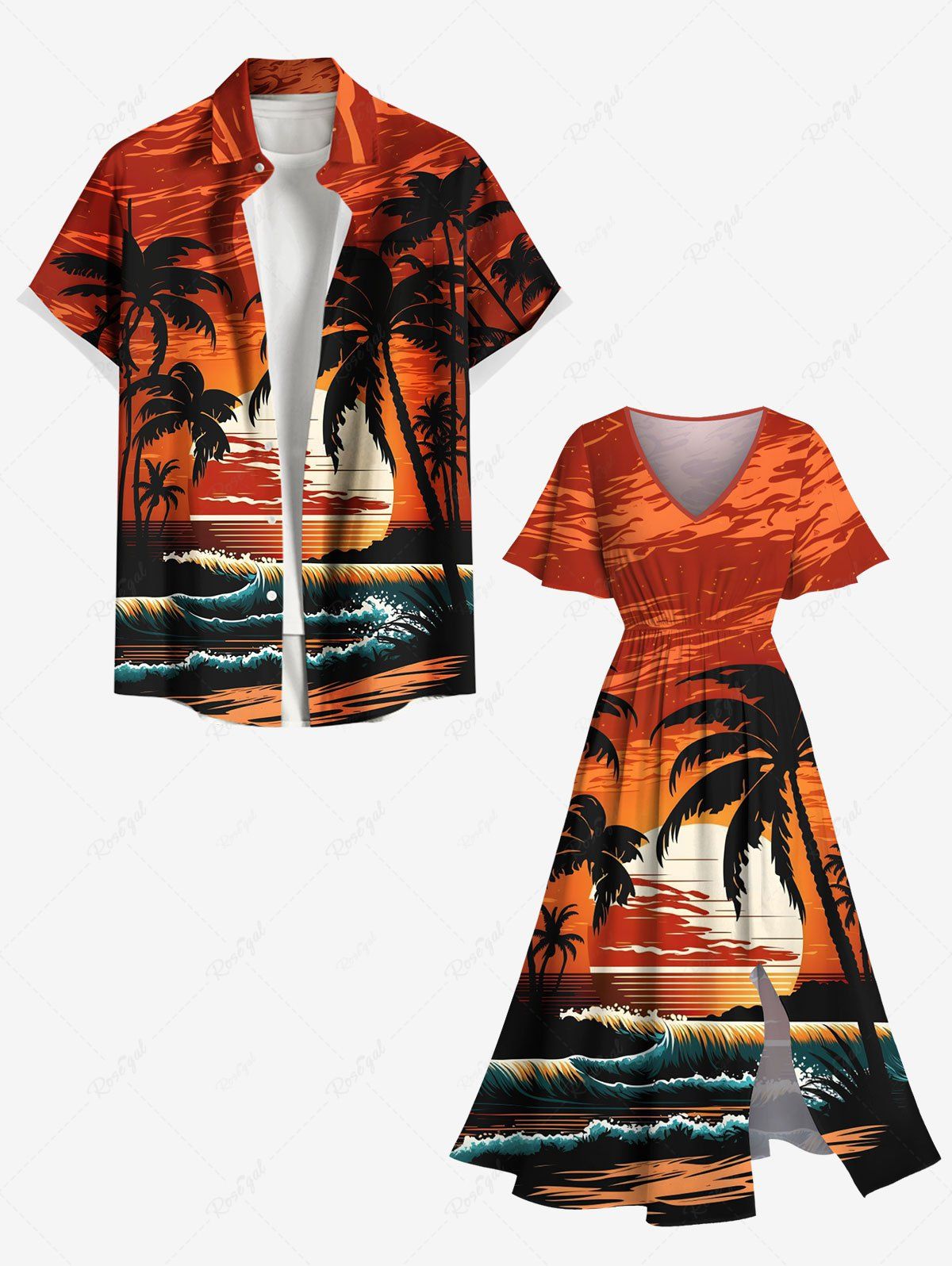 Tenue de plage hawaïenne assortie grande taille à imprimé cocotier, soleil et vagues pour couples