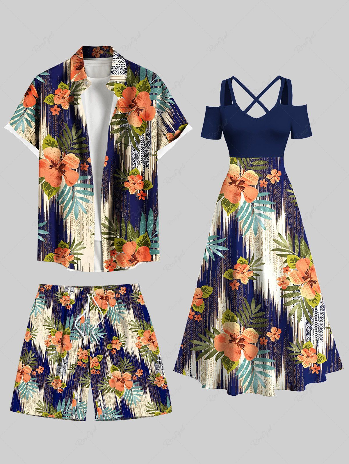 Tenue de plage hawaïenne assortie grande taille à imprimé feuilles tropicales et fleurs d'hibiscus et vagues pour couples