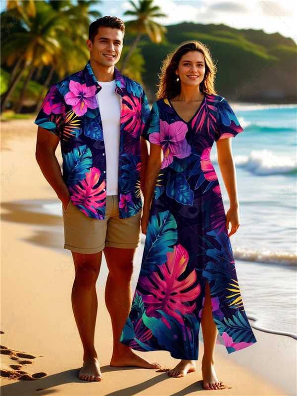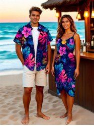 Tenue de plage hawaïenne assortie grande taille à imprimé feuilles tropicales et fleurs d'hibiscus pour couples