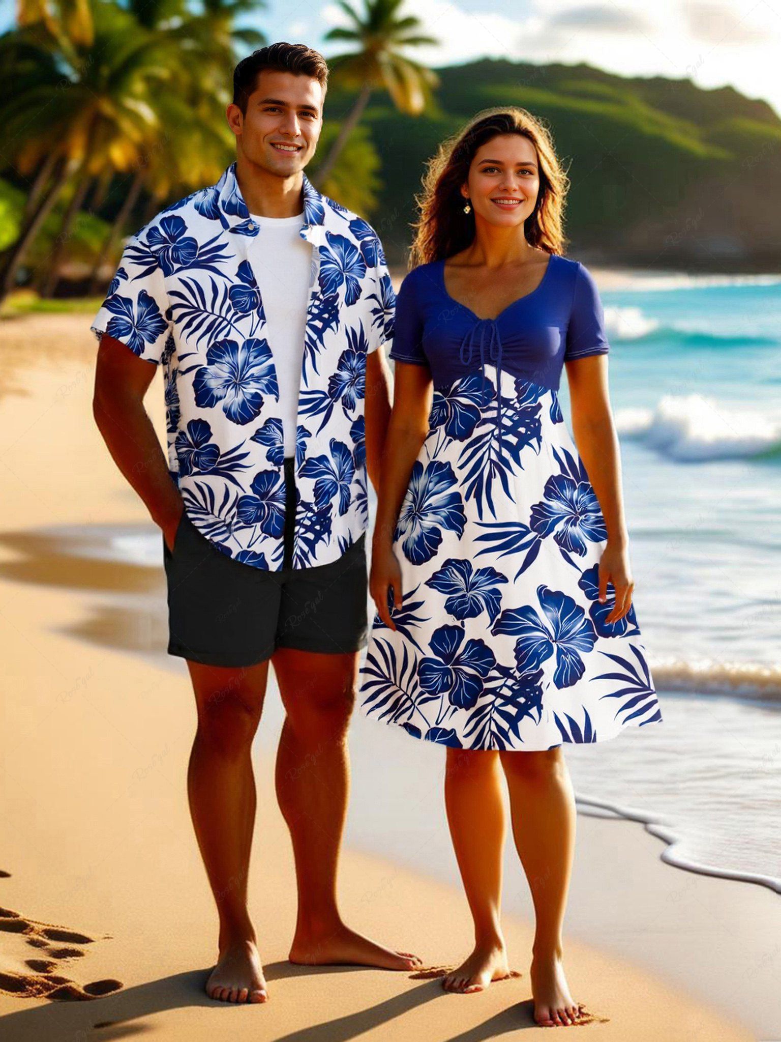 Tenue de plage hawaïenne assortie grande taille à imprimé feuilles tropicales et fleurs d'hibiscus pour couples