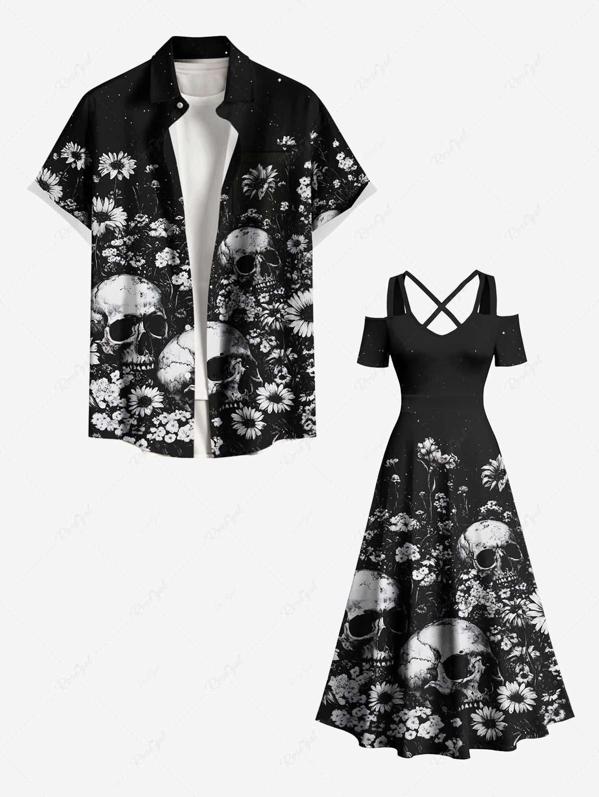 Tenue de plage hawaïenne assortie grande taille à imprimé tournesols et crânes pour couples