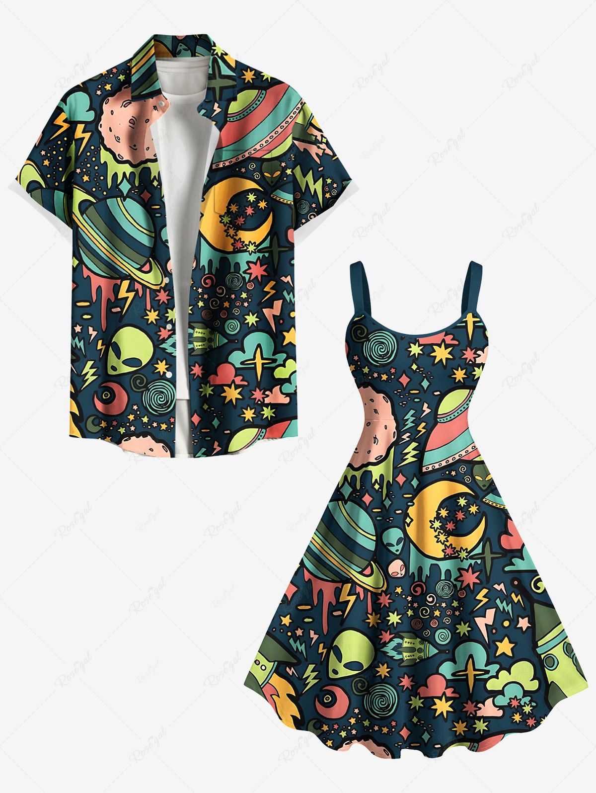 Tenue de plage hawaïenne assortie grande taille pour couples, motif galaxie, étoile, lune, planète, extraterrestre