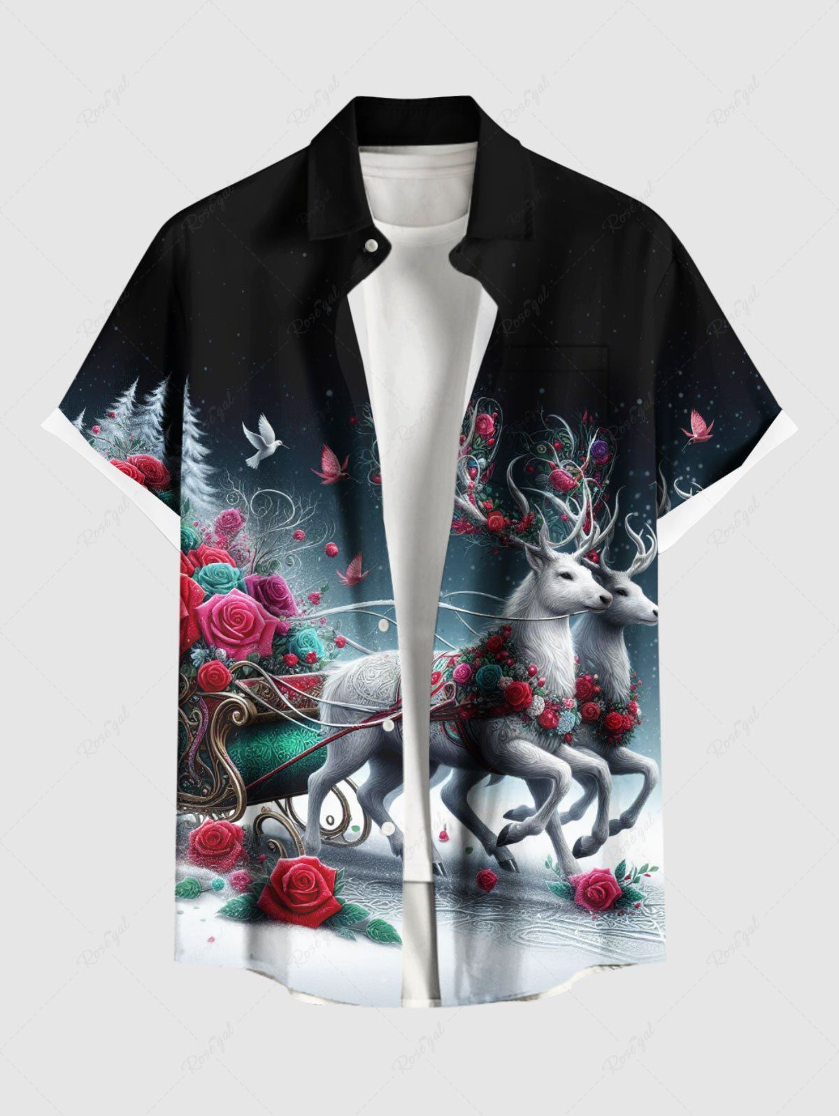 Chemise grande taille homme à imprimé ombré sapin de Noël, élan, rose, fleurs et oiseaux, poche boutonnée - S